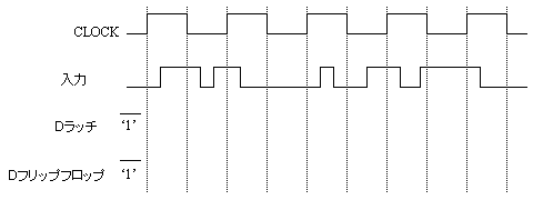 2) 以下の波形をそれぞれ、DラッチとDフリップフロップに入力した時の波形を描け