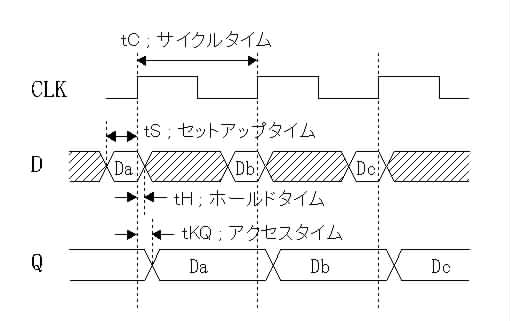 | tS | セットアップタイム | クロックエッジに対するデータを用意する時間、スペックでは最小値が規定される。 |