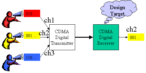 今回は携帯電話の通信方式として用いられている、Code Division Multiple Access (CDMA)方式を用いたデジタル通信の受信機の設計を行います。とは言え、学生レベル対象のデザイン・コンテストですので、小さめの規模のデジタル設計を念頭に置き、各個人ごとに色々な工夫ができるように、実現方法には自由度をある程度与えています。