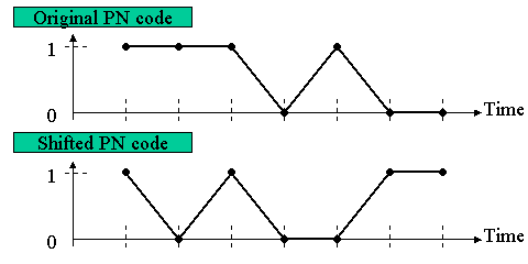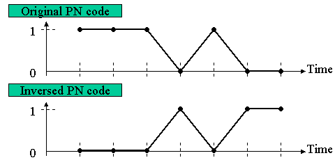 以上の性質より、1ビットの情報すなわち、1もしくは0を送信する時場合、’0’の意味で元PNコード(PN1)を送信し、’1’の意味で反転させたPNコードを送る。