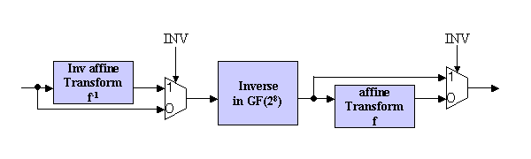 When INV signal is '0', input data first goes to Inverse Block then transferred to affine transform, and when INV signal is asserted (='1'), input data is first transformed in Inv Affin Block and later Inverse in GF(28) is caluculated.