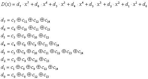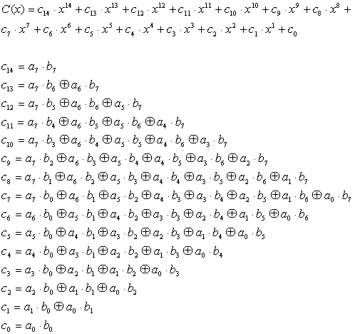 Since D(x) expresses GF(28) , the multiplication result of two numbers in GF(28) A= (a7, a6, a5, a4, a3, a2, a1, a0)AB=(b7, b6, b5, b4, b3, b2, b1, b0) will be D=(d7, d6, d5, d4, d3, d2, d1, d0) .