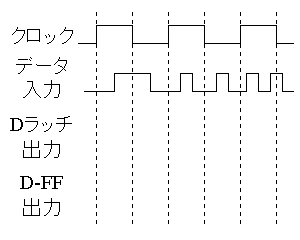 | Dラッチの動作説明図 | Dラッチの動作波形 クロックHIGHではデータが転送 クロックLOWではデータ保持 |