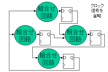 3) 説明したように、デジタル回路ではD-FFを介して、組み合せ回路がデータの交換を