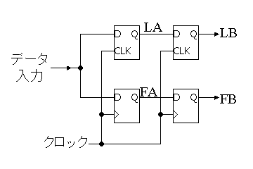 2) 上記1)と同じクロック、データ入力波形を以下のような、Dラッチ2段とD-FF2段の回路に入力した場合の出力端LB、FBの波形を示せ。LAとFAは上記1)に対応する。