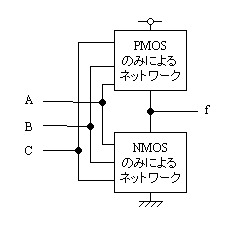 逆に、PMOSネットワークが導通状態の時は、必ずPMOSネットワークは遮断状態となり、出力fは電源電位になる。